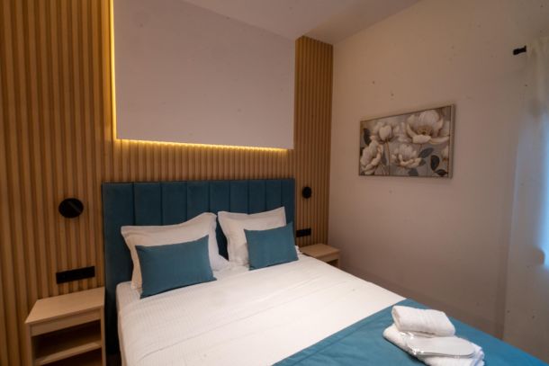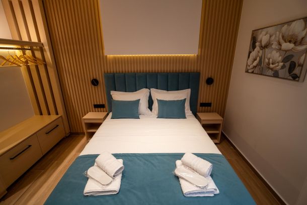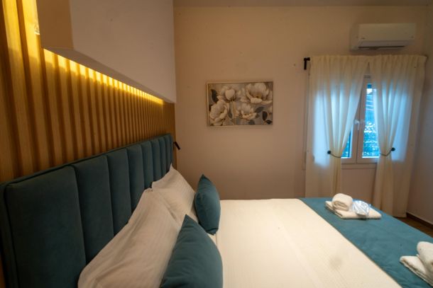 Το Δωμάτιο 1 του Azzuro είναι ένας κομψά διαμορφωμένος χώρος, ιδανικός για ζευγάρια, μικρές οικογένειες ή παρέες έως 4 ατόμων. Διαθέτει ένα άνετο king size κρεβάτι και έναν καναπέ-κρεβάτι που μετατρέπεται εύκολα σε χώρο ύπνου.