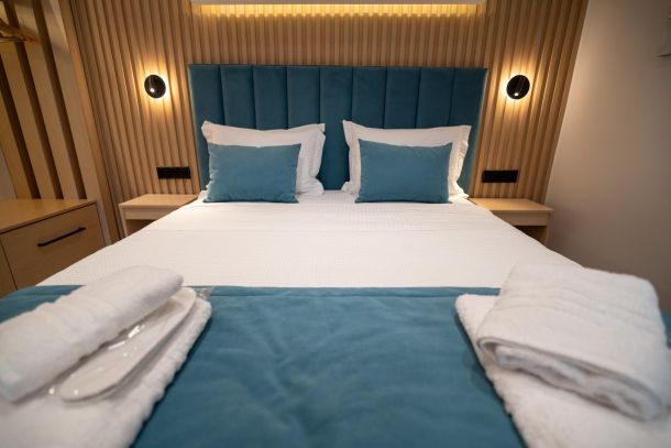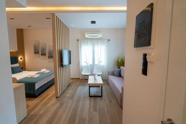 Το Δωμάτιο 2 του Azzuro είναι ένας κομψά διαμορφωμένος χώρος, ιδανικός για ζευγάρια, μικρές οικογένειες ή παρέες έως 4 ατόμων. Διαθέτει ένα άνετο king size κρεβάτι και έναν καναπέ-κρεβάτι που μετατρέπεται εύκολα σε χώρο ύπνου.